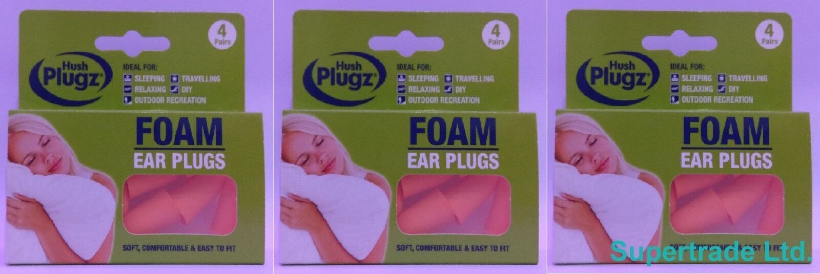 Hush Plugz Foam Ear Plugs Earplugs High Quality Soft Comfortable Fit 4 Pairs X 3