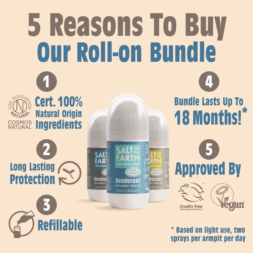 The Naturally Bold Roll-On Trio delivers rich, distinctive fragrances with woody, citrus, and ocean-inspired notes. A refillable deodorant set for those who like their freshness with a little edge.